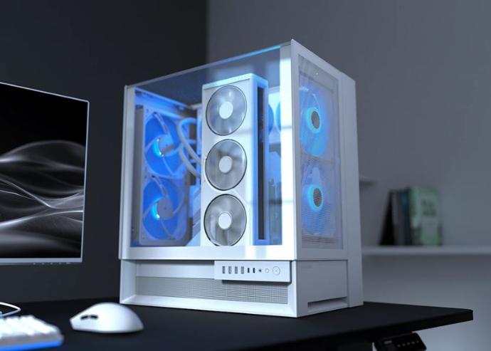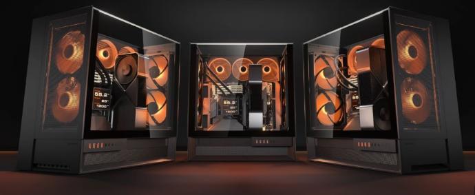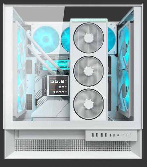 Primer -y único- gabinete de PC en el mercado con ventiladores PWM cuádruples de 160 mm preinstalados, el OmnyX ofrece un flujo de aire superior directamente desde el gabinete, con espacio para una capacidad total de 7 ventiladores. La alineación reflejada delantera-trasera crea un efecto jetstream naturalmente fuerte, con dos ventiladores montados en la parte delantera aspirando aire frío y dos ventiladores montados en la parte trasera expulsando aire caliente directamente y sin interrupciones. Una distribución equitativa de ventiladores con aspas reversas y delanteras permite modos de admisión flexibles, creando un flujo de aire suave y direccionalmente consistente sin importar la forma en que decida orientar su estructura.