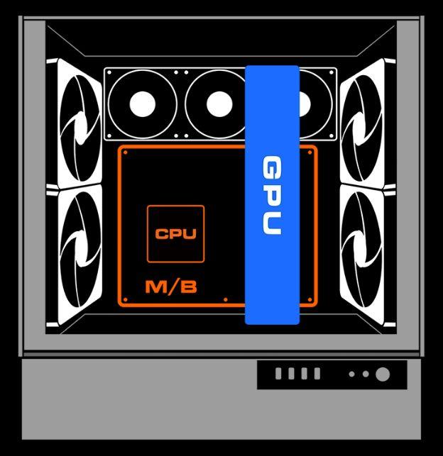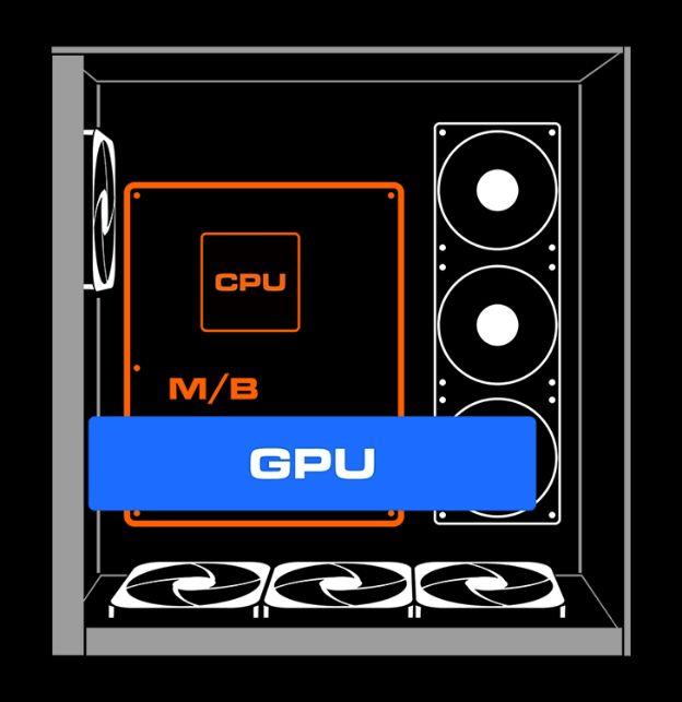 Bloqueando una capacidad de ventilador frontal y trasero absolutamente reflejada, maximiza el área de superficie de la GPU en contacto con un flujo de aire constante y máximo, independientemente de la orientación del gabinete.