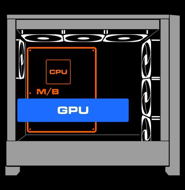 El OmnyX acomoda una longitud máxima de GPU de 380mm que puede ser montada verticalmente sin un soporte, maximizando el área de exposición de la superficie al flujo de aire para una refrigeración superior. Esto también alinea naturalmente la GPU con la gravedad para la estabilidad inherente, reduciendo el riesgo de daños en el hardware premium por desplazamiento accidental.