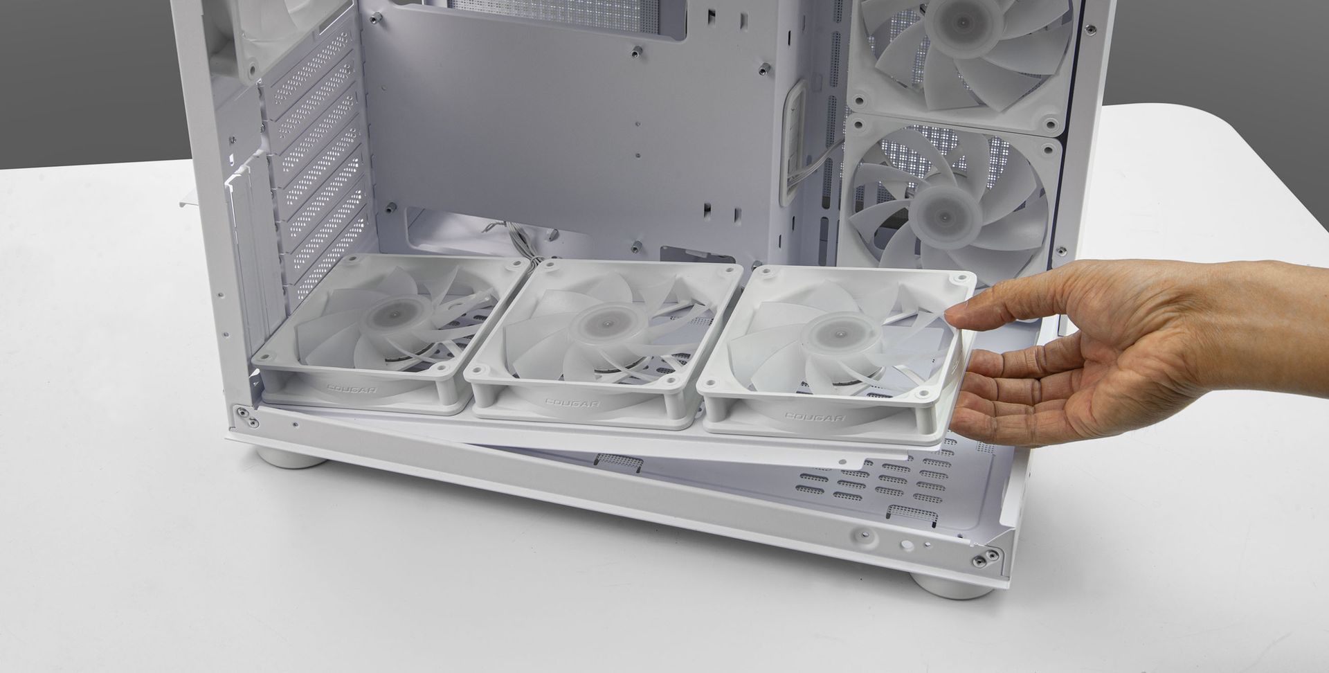 Nuestra prioridad es la comodidad del usuario con el soporte de ventilador inferior que permite fijar los ventiladores directamente antes de la instalación, ahorrándole tiempo y esfuerzo.