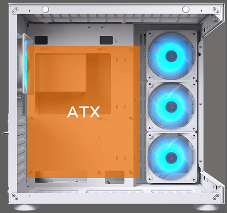 El FV150 RGB tiene una capacidad de 3 x 120mm o 2x140mm en la parte superior e inferior, 3 ventiladores de 120mm en el lateral, y 1 x120mm en la parte trasera. (Los ventiladores laterales y traseros ARGB además del fan hub están preinstalados.) El soporte de refrigeración por agua tiene un máximo de 360mm en la parte superior y 240mm en el lateral.
