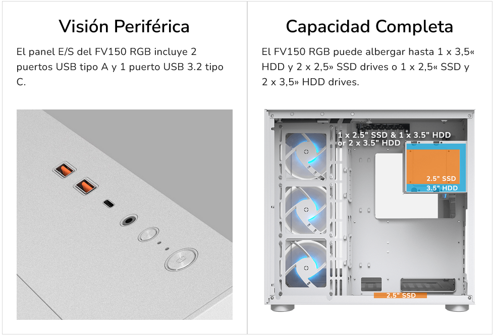 Con capacidad para GPU de hasta 400 mm y soporte para orientación vertical, el FV150 RGB alberga componentes de alto rendimiento para los juegos modernos.