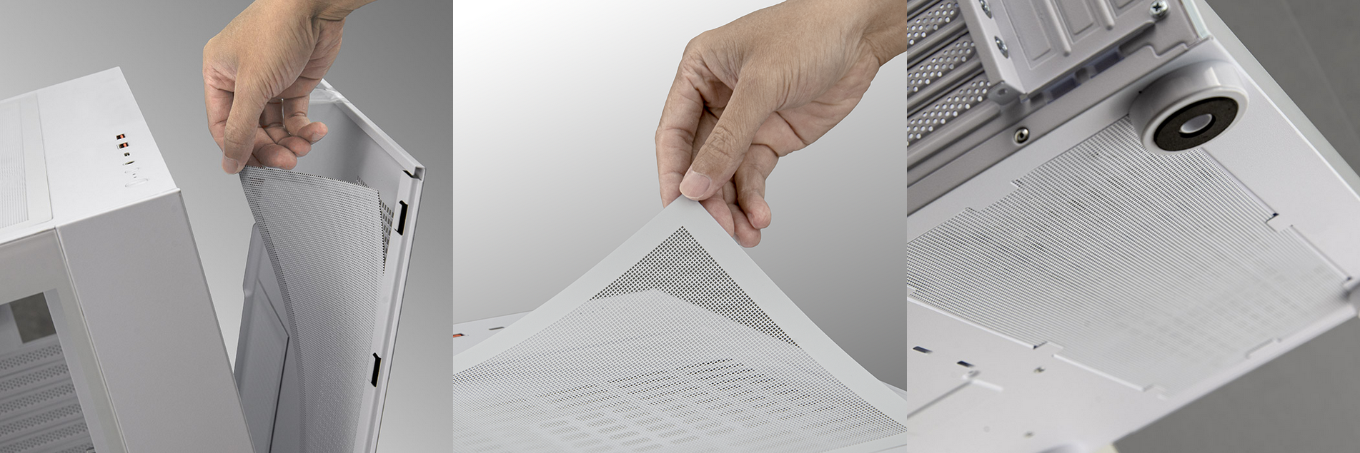 Los filtros antipolvo en los tres laterales ventilados impiden la entrada del polvo y mantienen limpios los componentes. Los filtros superiores y laterales se fijan magnéticamente, facilitando su extracción y mantenimiento.