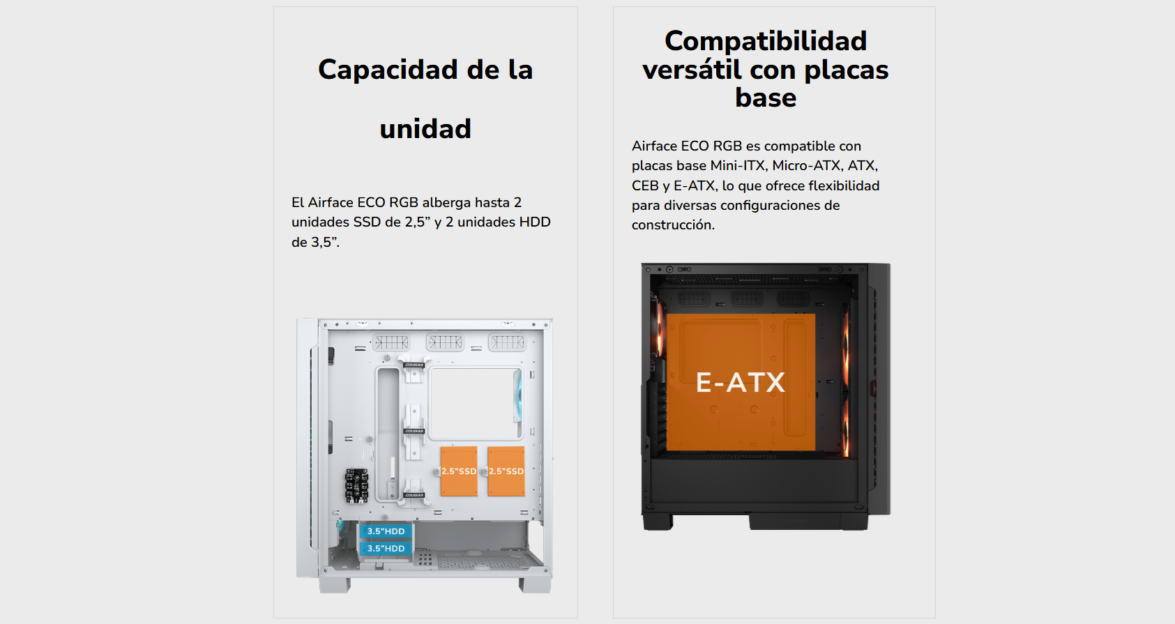 Dos potentes ventiladores frontales de refrigeración PWM de 180 mm mantienen el sistema frío bajo cargas pesadas. Estos ventiladores están preinstalados para proporcionar un flujo de aire óptimo desde el primer momento, con velocidades que se modulan según las necesidades del sistema. El Airface ECO RGB también viene con un ventilador de escape trasero de 120 mm preinstalado.