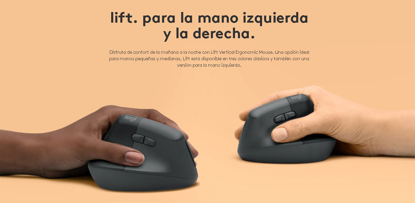 La silueta orgánica de Lift se adapta como un guante a manos pequeñas y medianas, especialmente diseñada y esculpida por el equipo de expertos en ergonomía y diseño de Logitech. ¿Tienes dudas sobre el tamaño de tu mano?
