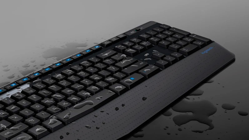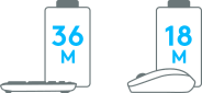 El teclado tiene un diseño resistente a salpicaduras8Sometido a pruebas en condiciones limitadas (máximo de 60 ml de líquido). No sumerjas el teclado en ningún líquido., teclas resistentes y robustas patas inclinables con altura ajustable. Las baterías del teclado ofrecen una duración de 36 meses y las del mouse 189La duración de las baterías del mouse y del teclado depende del uso y de los dispositivos (con conmutadores de encendido/apagado). Entretanto puedes olvidarte de esos enojosos cambios.