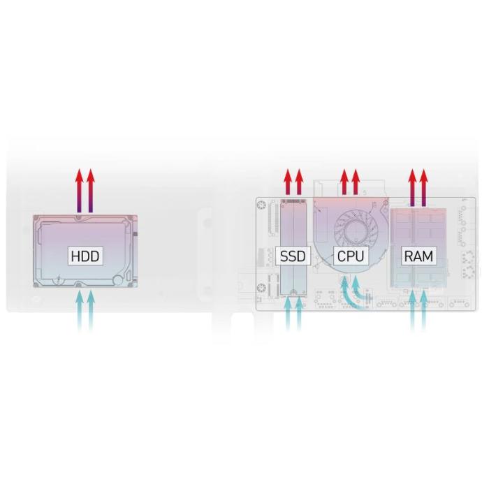 La serie moderna AM242 está equipada con un sistema de refrigeración Silent Pro. Parte de este sistema es un Módulo Térmico de Grado Servidor que gestiona la refrigeración de los diferentes componentes dentro del sistema. Aparte de eso, nosotros Pon los componentes clave más importantes en la parte superior para que el aire caliente puede moverse fácilmente hacia fuera y separamos el flujo de aire para asegurarnos de que La temperatura del sistema se mantiene perfectamente controlada para un enfriamiento y Operación silenciosa.