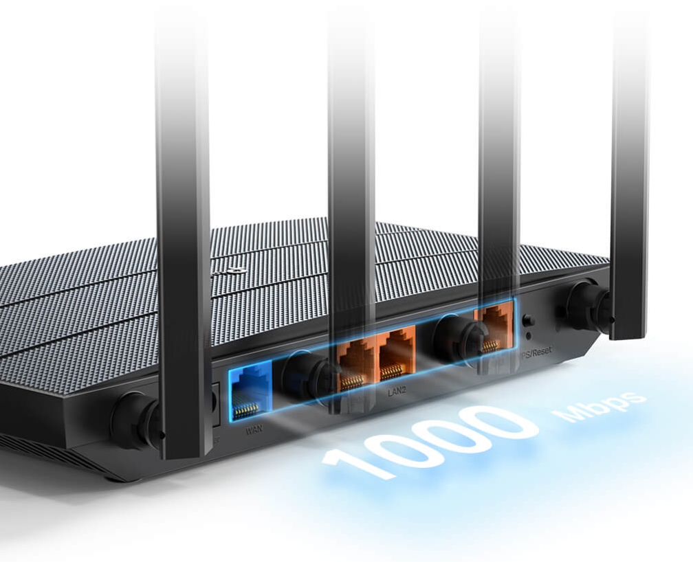 Todos los puertos Ethernet Gigabit te permiten aprovechar al máximo tu velocidad de banda ancha de hasta 1 Gbps. Conecta tus PC, Smart TVs y consolas de juegos a uno de los tres puertos LAN Ethernet Gigabit para conexiones por cable rápidas y confiables.