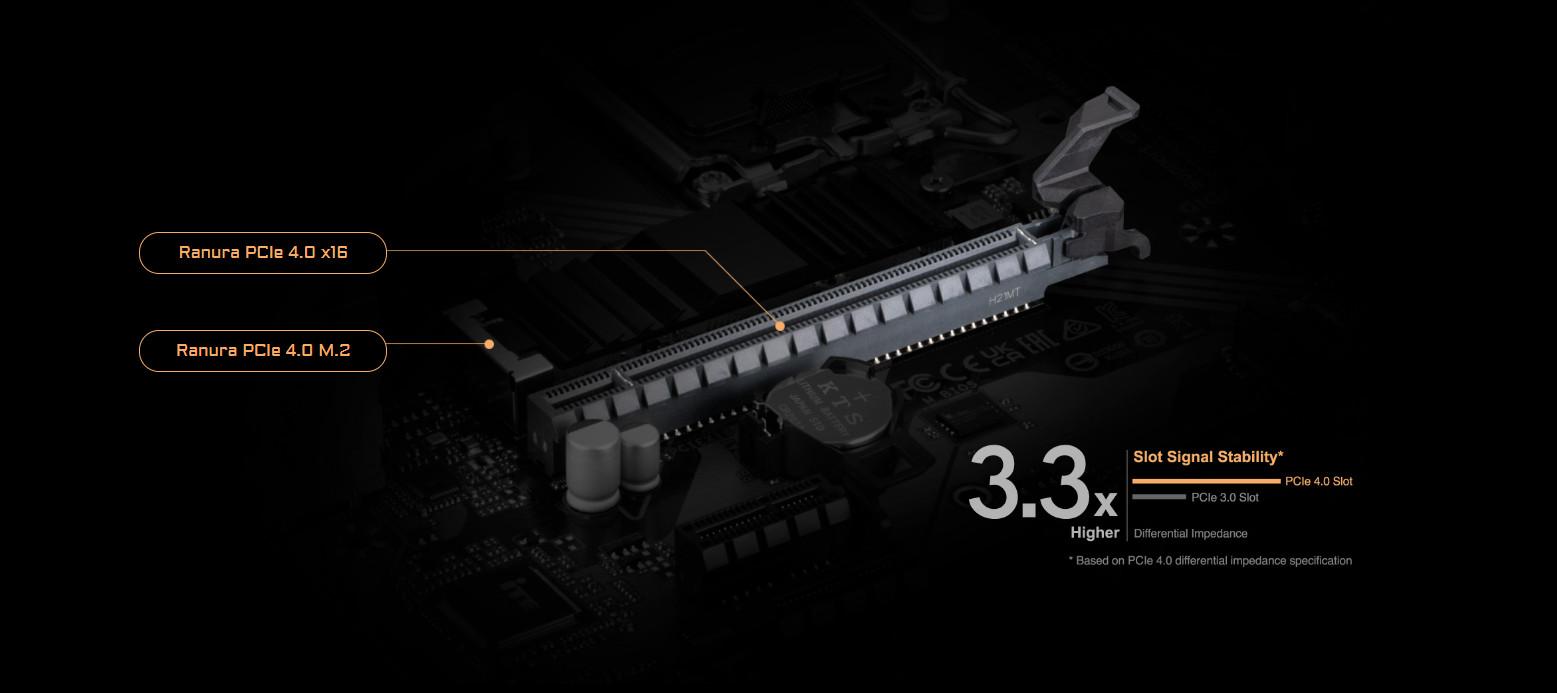 Las placas base GIGABYTE B760 están listas para funcionar con los dispositivos PCIe 4.0 que se espera que experimenten el triple de ancho de banda que los dispositivos PCIe 3.0 actuales. Para alcanzar alta velocidad y mantener una buena integridad de la señal, el departamento de I+D de GIGABYTE utiliza PCB de baja impedancia para proporcionar el máximo rendimiento.