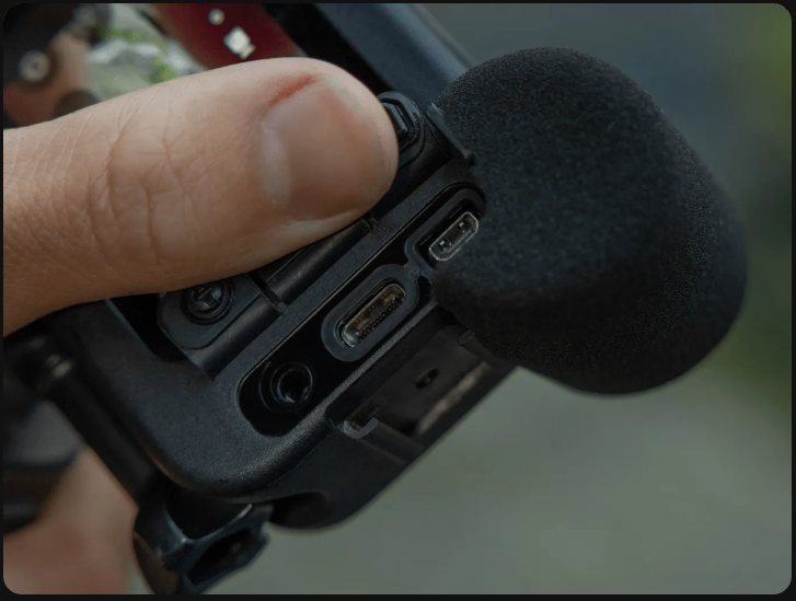 Cuenta con dos soportes para zapata fría, un puerto micro HDMI y un puerto USB-C. ¿Tienes tu propio micrófono? También hay un puerto para micrófono de 3,5 mm.