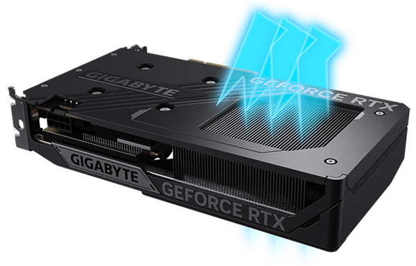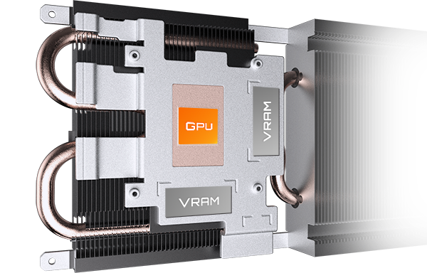 La placa de cobre entra en contacto directo con la GPU, junto con los tubos de calor de cobre compuestos, que transfieren rápidamente el calor de la GPU y la VRAM al disipador de calor.