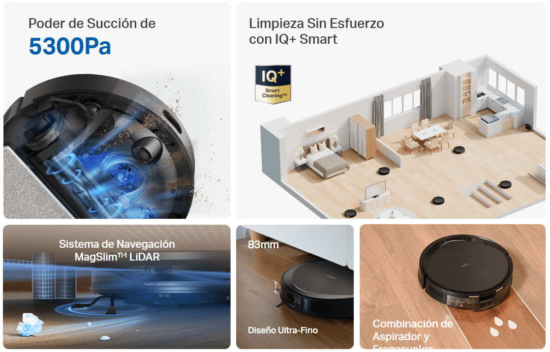 La potencia de succión mejorada de 5300Pa garantiza que el robot aspire el polvo, el pelo de las mascotas, las migas y otros residuos sin complicaciones.