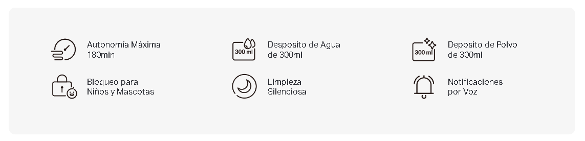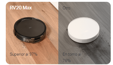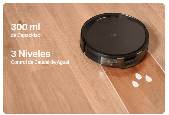 La aspiradora absorbe el polvo y la mopa la suciedad incrustada. El fregado es esencial para los hogares con suelos duros que necesitan un pulido regular. RV20 Max ofrece 3 niveles de agua que se adaptan a los distintos tipos de suelo.