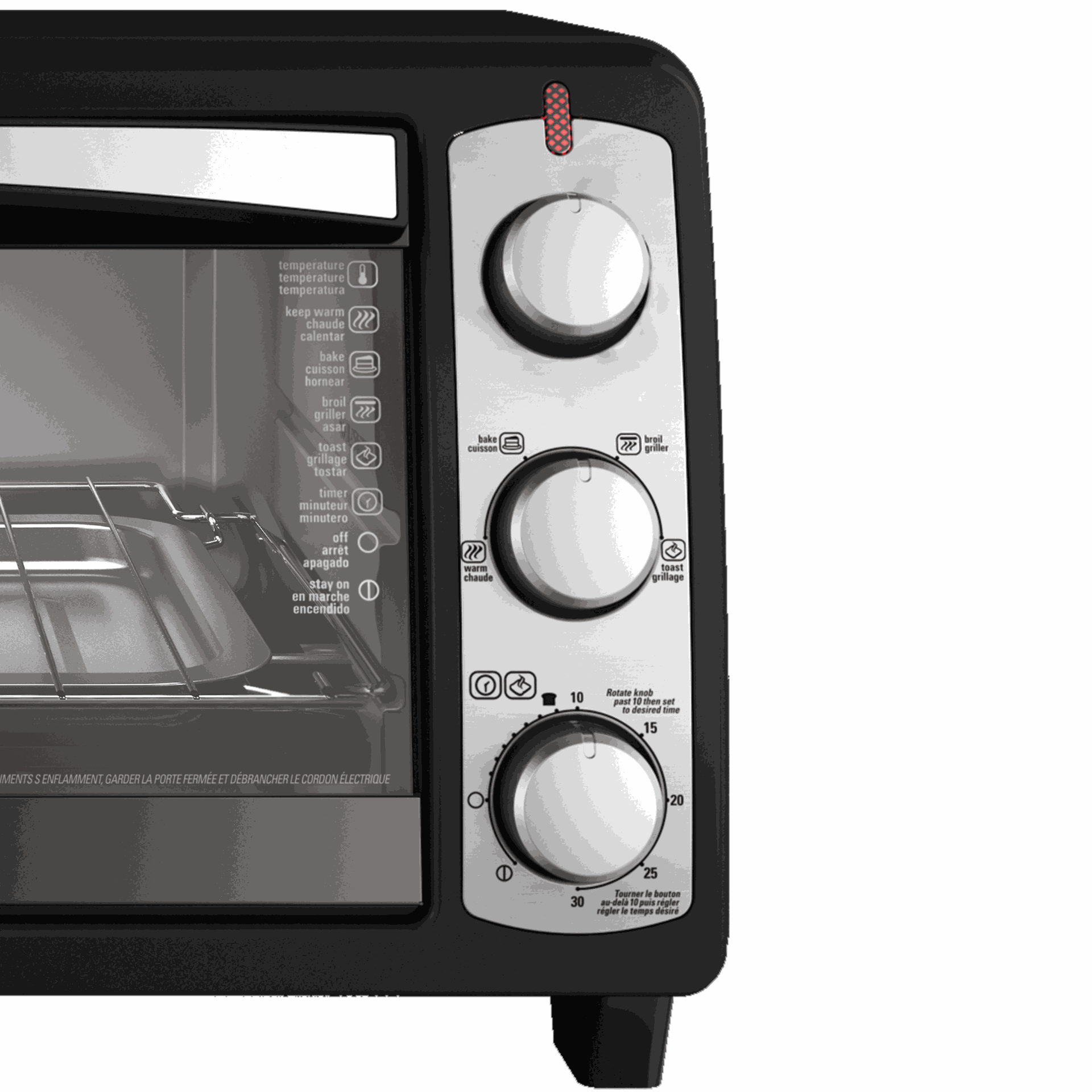 El horno de seis rebanadas de pan BLACK+DECKER tiene el interior diseñado para el enfoque hacia la comida rápida e incluso cocinar. Las funciones de cocción son hornear, asar, tostar y mantener caliente. Tiene una capacidad para una pizza de 9" o seis rebanadas de pan.
